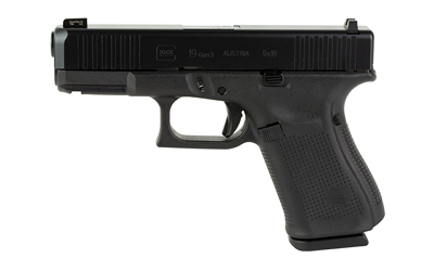 Glock 19 Gen 5, Striker Fired, Compact Size, 9MM, 4.02″ Marksman Barrel, Polymer Frame, Matte Finish, Ameriglo Ultimate Carry Night Sights (Green Tritium Front Sight with Lumigreen Outline, Black Serrated U-notch Rear), 15Rd, 3 Magazines, Front Serrations, Ambidextrous Slide Stop Lever, Flared Mag Well, nDLC Finished Slide and Barrel, No Finger Grooves PA195S303UC
