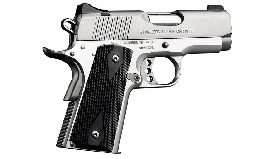 Kimber Stainless Ultra Carry II, Semi-automatic, 1911, Full Size, 45 ACP, 3″ Barrel, Matte Finish, Silver, Laminate Grips, Adjustable Sights, 7 Rounds, California Compliant 3200062CA