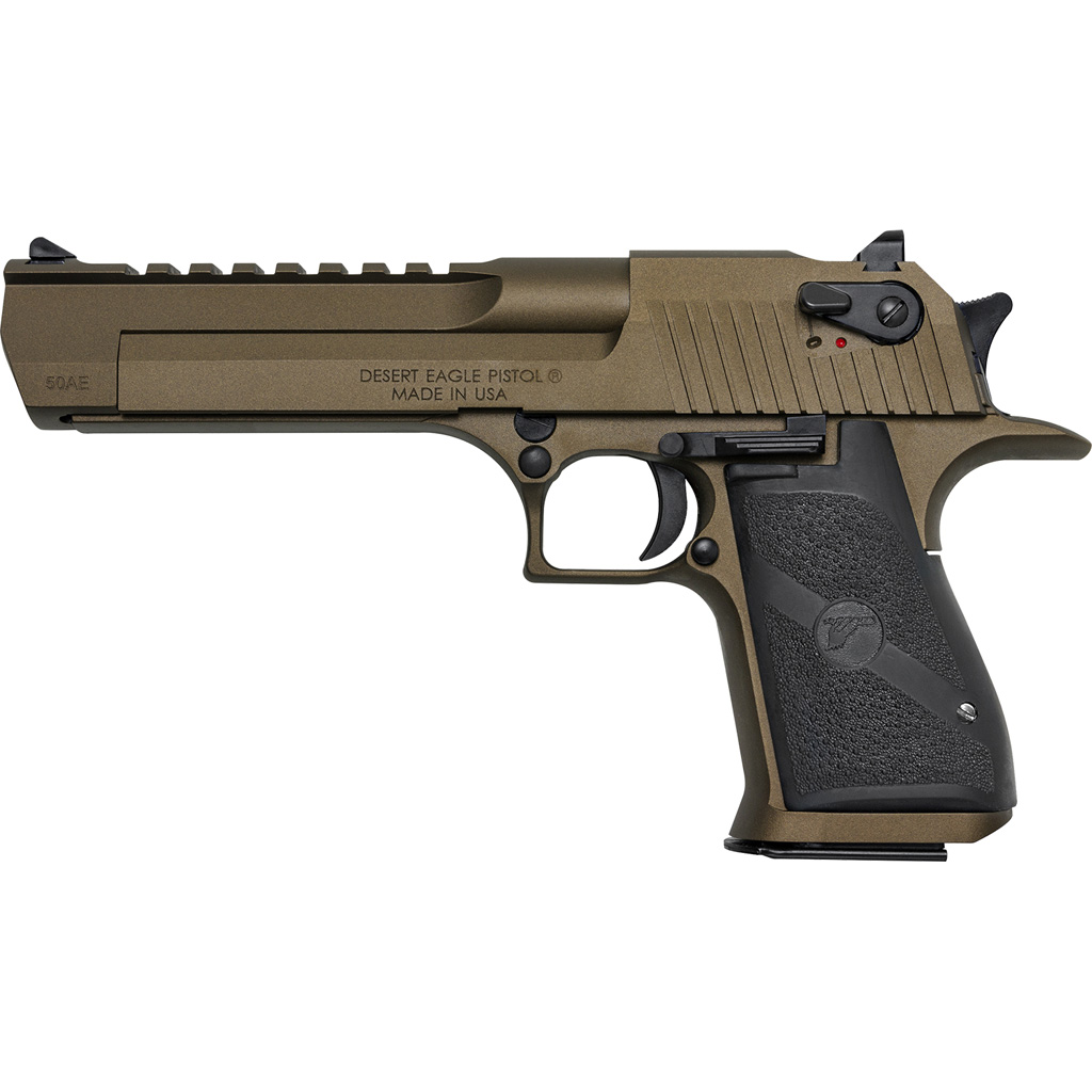 The Mark XIX Desert Eagle is a gas-operated, semi-automatic pistol that holds a 7 round capacity and measures 10.75 in length with a 6 inch barrel available in a burnt bronze cerakote finish. The width is 1.25, height is 6.25 and the weight with an empty magazine is approximately 72 ounces. It has a trigger reach of 2.75 and a sight radius of 8.5 with the 6 inch barrel. The construction of the Mark XIX utilizes CNC machine technology providing specifications with tight tolerances. The grip is anatomically formed and provides an ideal hand seating angle for two-handed shooting allowing for comfortable firing. The picatinny style accessory rail allows for aftermarket optics and scope rings.