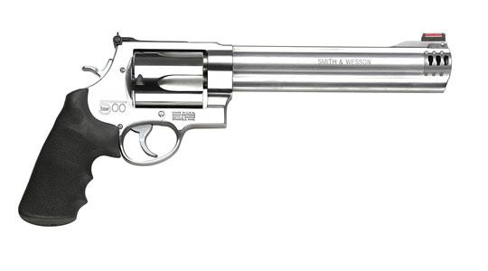 Action: SA/DA – Caliber: .500 S&W Magnum – Capacity: 5 – Finish: Stainless – Material: Steel – Grips: Black Synthetic – Sights: Light Gathering HI-VIZ® Red Dot / Adjustable – Barrel Length: 8.38 – Overall Length: 15 – Weight: 72.5 oz – Most Powerful Production Revolver in the World Today – Massive .500 S&W Magnum® Cartridge – 2600 ft/lb. Muzzle Energy – A Hunting Handgun For Any Game Animal Walking – Removable High Efficiency Compensator – HIVIZ® Red Dot Interchangeable Front Sight – In 2003 the gunsmiths and engineers at Smith & Wesson wanted to deliver maximum power for serious handgun hunters. The power they sought required an entirely new frame the massive X-Frame and was the basis for the new Model S&W500 the most powerful production revolver in the world. This ushered in the era of the big gun and was only the beginning. For ultimate power and velocity there’s nothing even close to an X-Frame model handgun.